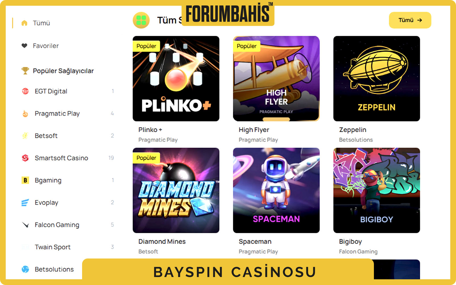 Bayspin casino bölümünde slotlar, masa oyunları, jackpotlar ve canlı casino masaları bulunuyor. Özellikle Pragmatic Play ve Evolution Gaming’in oyunları, yüksek RTP oranları ve kaliteli grafiklerle dikkat çekiyor. Canlı casino masalarında ise gerçek krupiyeler eşliğinde blackjack, rulet, bakara gibi klasikler ile oyun şovları oynayabilirsiniz. Ayrıca, günlük turnuvalar ve özel ödüller de casino oyuncuları için ekstra cazibe yaratıyor. Benim önerim, yeni çıkan slot oyunlarını ve canlı rulet masalarını denemeniz; genellikle promosyonlar bu alanlarda yoğunlaşıyor.