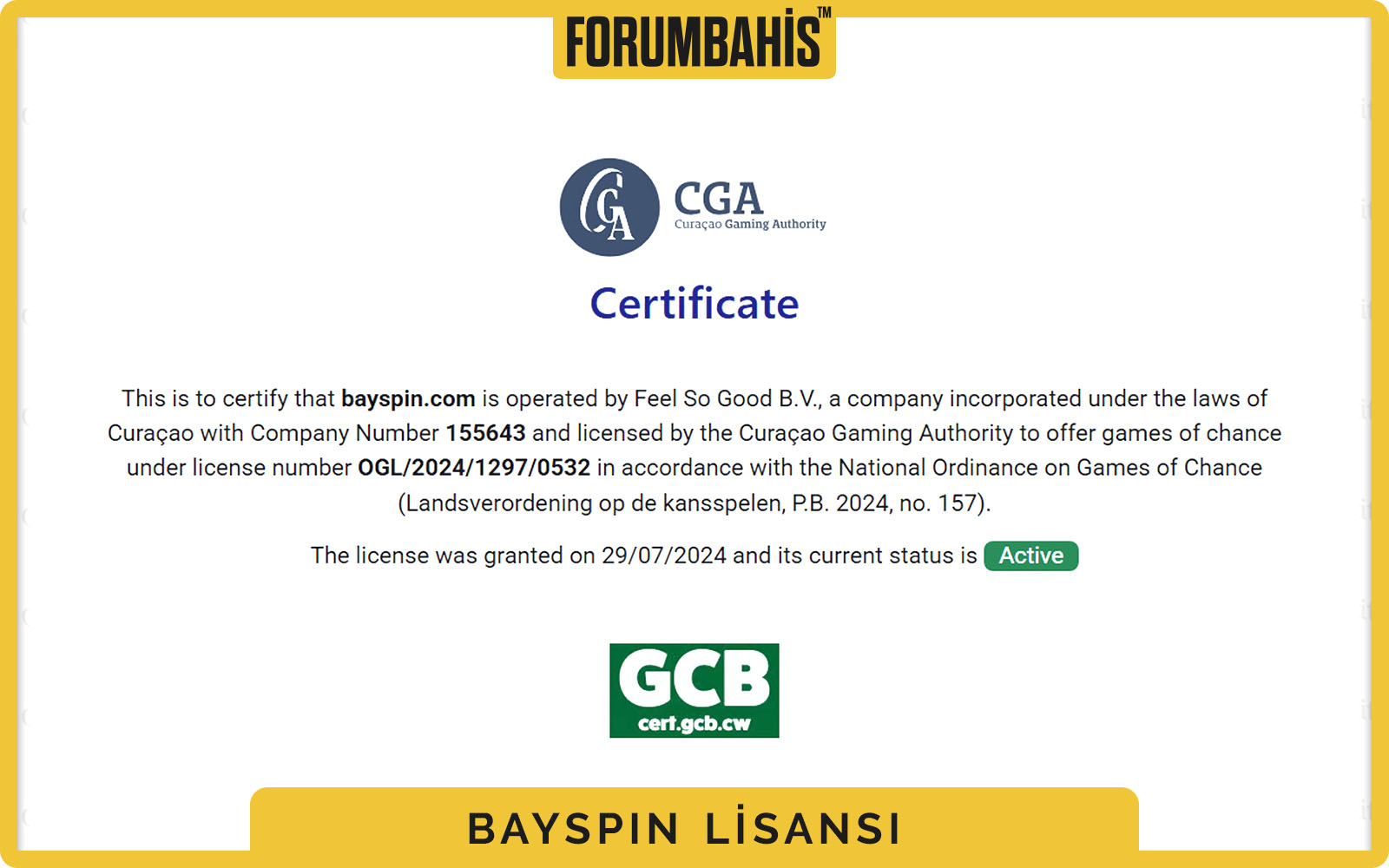 Bir bahis sitesinin güvenilirliğini belirleyen en önemli kriterlerden biri lisansıdır. Bayspin, Curaçao eGaming lisansı ile faaliyet gösteriyor ve 155643 lisans numarası hem ana sayfada hem de kullanıcı sözleşmesinde açıkça belirtilmiş. Lisanslı bir platform olması, kullanıcı haklarının korunması ve adil oyun ilkesinin gözetilmesi açısından büyük önem taşıyor. Ayrıca, Bayspin’in oyun altyapısı uluslararası standartlarda; tüm finansal işlemler ve kişisel veriler SSL şifreleme teknolojisiyle korunuyor. Oyun sonuçları, RNG (Rastgele Sayı Üreticisi) algoritmalarıyla belirleniyor ve bu da adil oyun deneyimi sağlıyor.