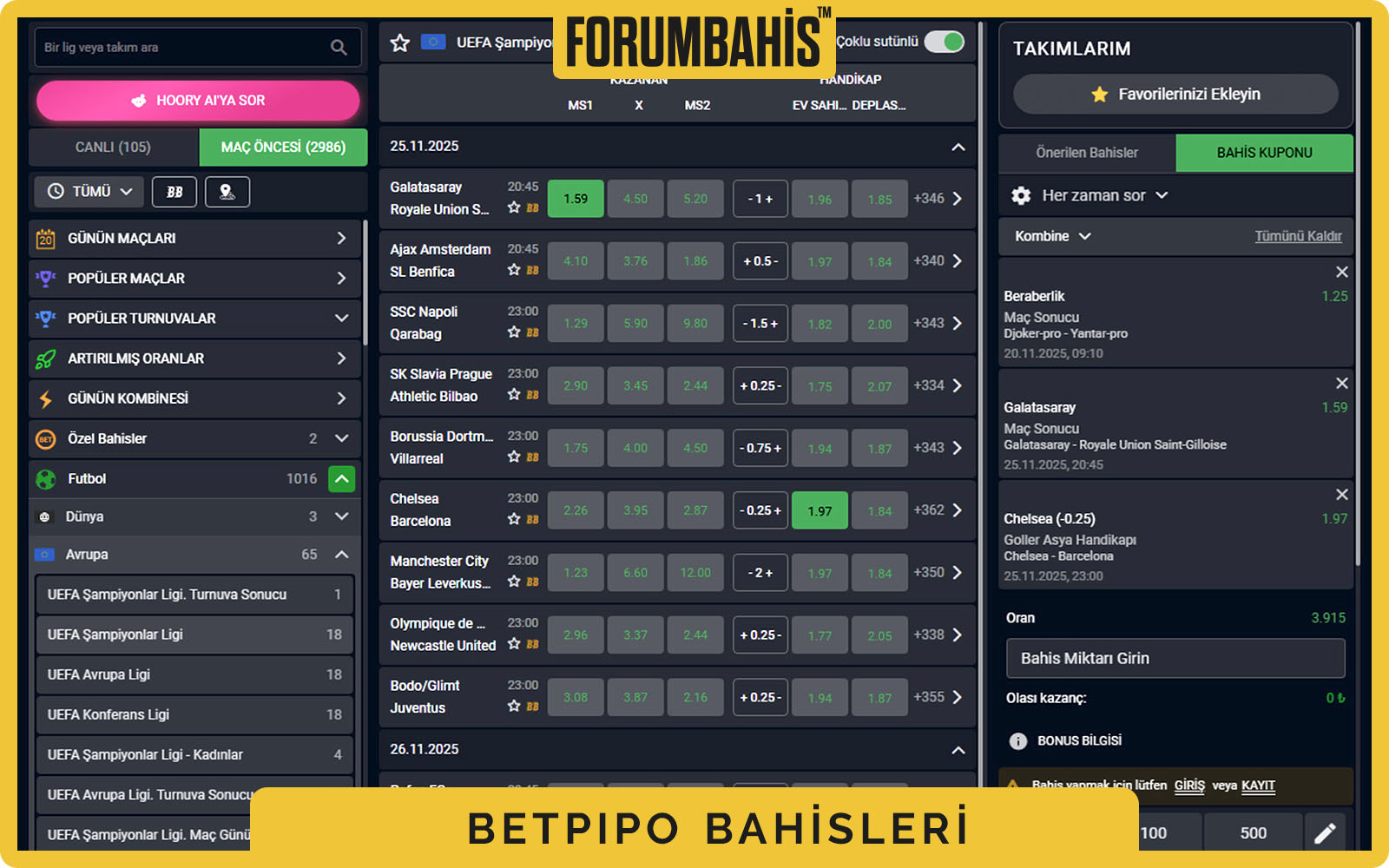 Betpipo’da spor bahisleri ve casino deneyimi, kullanıcılarına oldukça geniş bir yelpaze sunuyor. Özellikle BetConstruct altyapısının sağladığı yüksek oranlar ve canlı bahis seçenekleri, platformu öne çıkarıyor. Futbol, basketbol, tenis gibi ana akım sporların yanı sıra, espor ve sanal bahislerde de oldukça fazla seçenek mevcut. Canlı bahislerde anlık oran güncellemeleri ve hızlı sonuçlar, heyecanı dorukta tutuyor. Benim deneyimime göre, oran rekabeti konusunda Betpipo ortalamanın üzerinde; özellikle derbi ve büyük turnuvalarda ekstra promosyonlar sunulabiliyor.