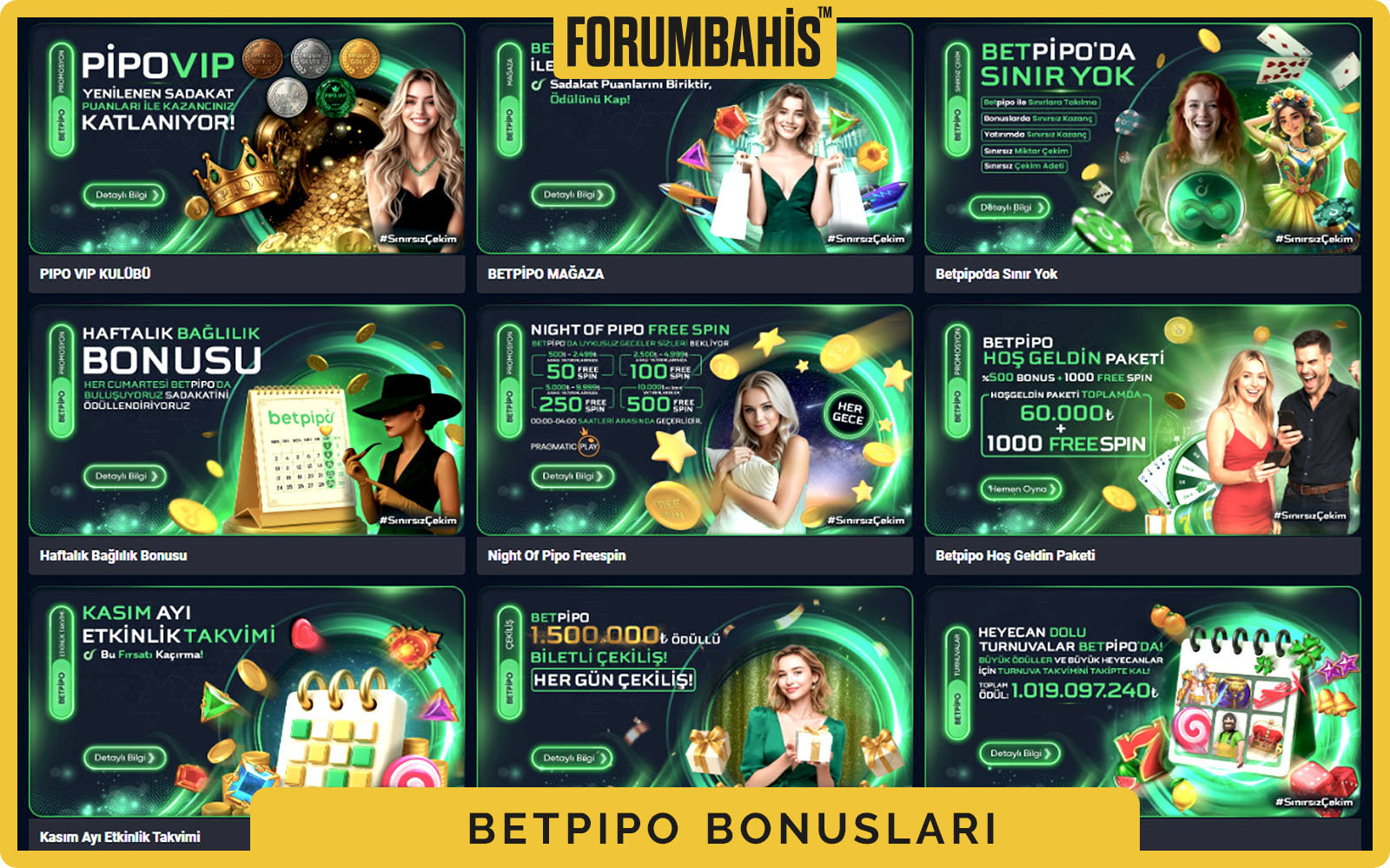 Betpipo, yeni üyeler için hoş geldin bonusu, kayıp bonusları, yatırım bonusları ve belirli oyunlara özel promosyonlar sunuyor. Hoş geldin bonusu genellikle %100 ve 2000 TL’ye kadar veriliyor; ancak çevrim şartları dikkatlice incelenmeli. Örneğin, bonus bakiyesinin ana bakiyeye aktarılması için genellikle 10x spor bahislerinde veya 25x casino oyunlarında çevrim yapılması gerekiyor. Kayıp bonusları ise haftalık olarak spor veya casino kayıplarınızın %10-15’ini geri almanızı sağlıyor. Benim favorim, düşük çevrimli ve anında verilen yatırım bonusları; çünkü bu tür promosyonlarda kazanma şansı daha yüksek.