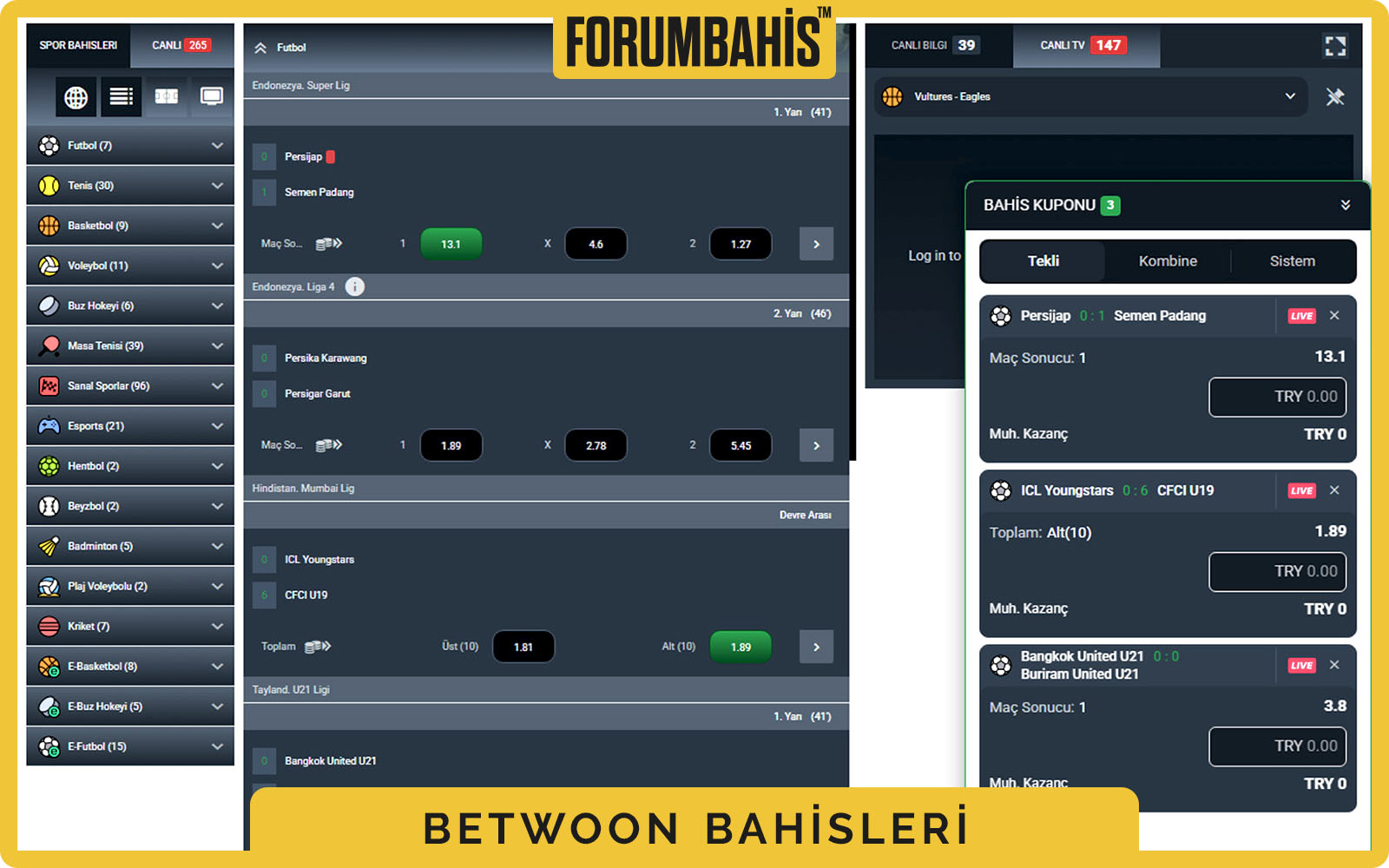 Betwoon, hem spor bahisleri hem de casino oyunları alanında oldukça geniş bir ürün yelpazesine sahip. Bu platformda futbol, basketbol, tenis gibi popüler spor branşlarına ek olarak e-spor, voleybol ve masa tenisi gibi alternatif bahis marketleri de bulabilirsiniz. Oranlar sektördeki ortalamalara yakın seyrediyor; bazı derbi maçlarda ise rakip sitelere kıyasla biraz daha yüksek oranlar sunulabiliyor. Canlı bahis seçeneği ise anlık güncellenen oranlar ve hızlı marketler ile öne çıkıyor. Özellikle maç sırasında bahis yapmak isteyenler için kullanıcı dostu bir arayüz sağlanmış.