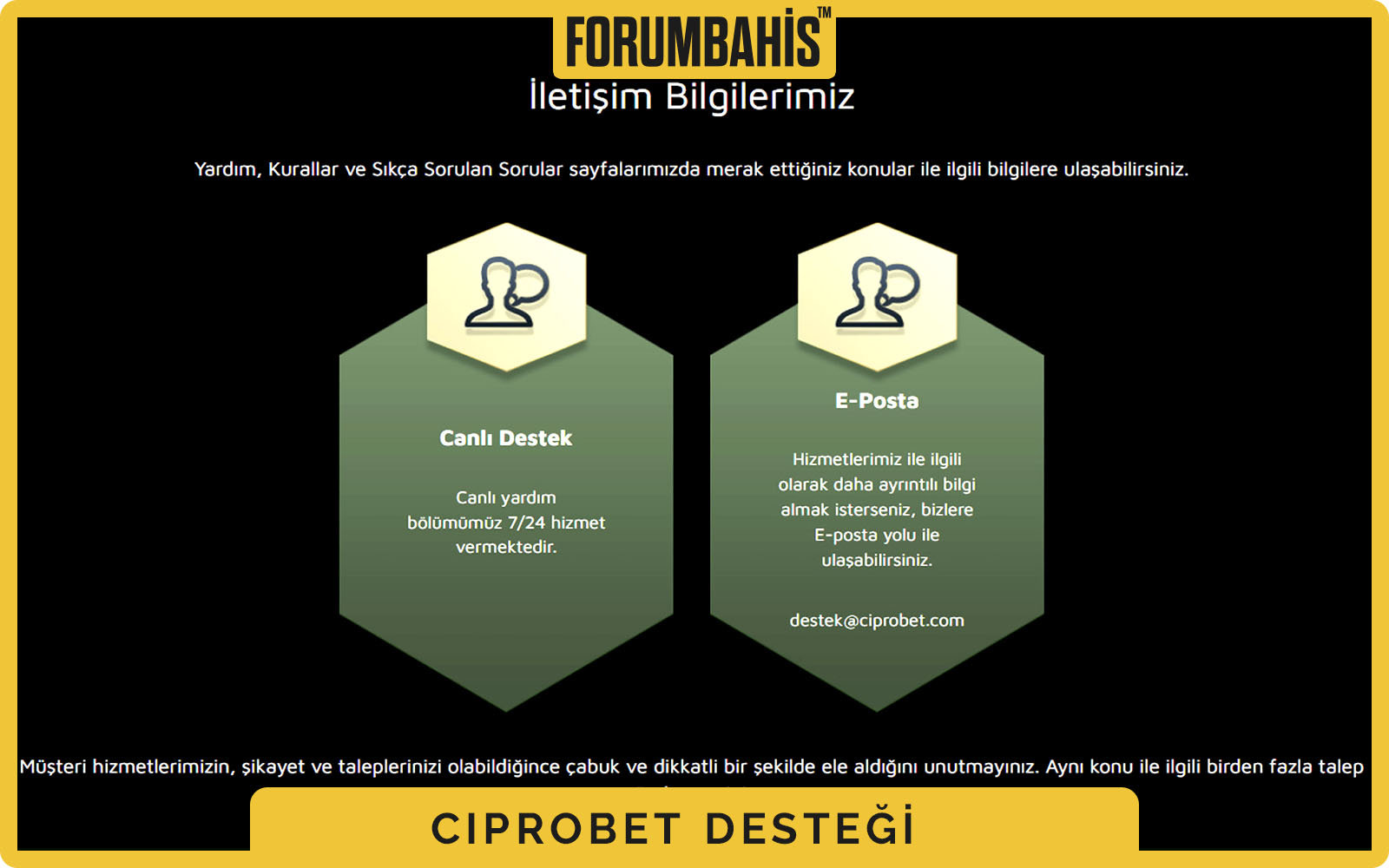 Müşteri hizmetleri, bir bahis sitesinin kalitesini belirleyen en önemli unsurlardan biri. Ciprobet, 7/24 aktif canlı destek hattı ve e-posta desteği sunuyor. Benim deneyimimde, canlı destek ekibi dakikalar içinde yanıt veriyor ve sorunu çözmek için samimi bir yaklaşım sergiliyor. Para çekim, bonus kullanımı veya teknik sorunlarda, destek ekibi net ve açıklayıcı bilgiler sunuyor.