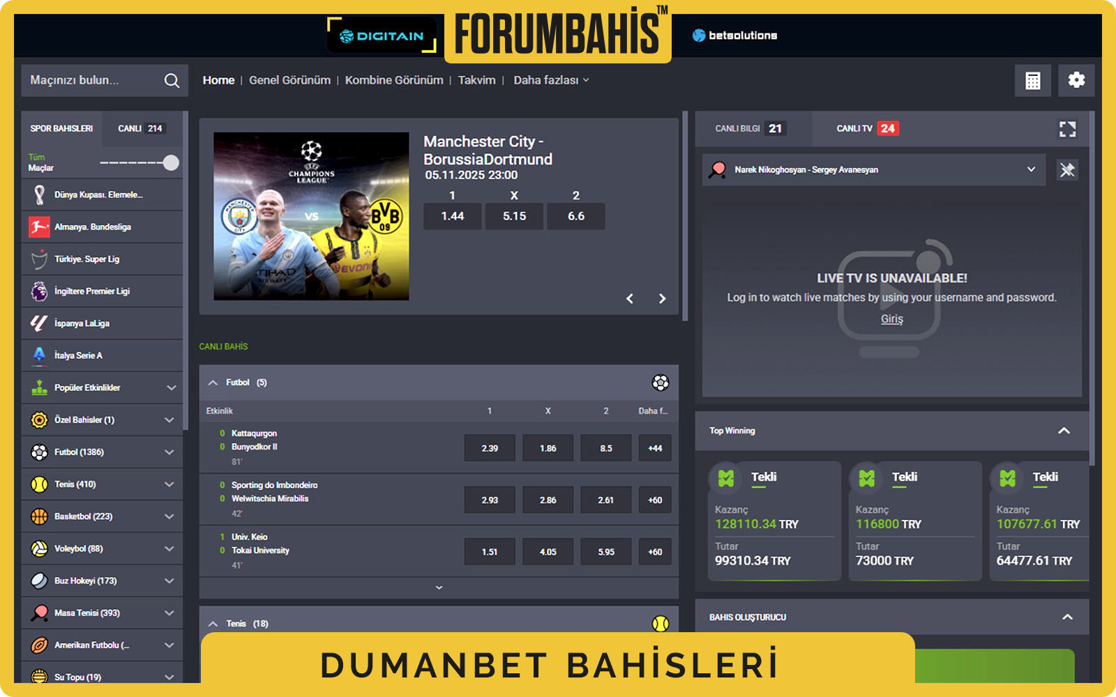 Canlı bahis, Dumanbet’in en çok tercih edilen bölümlerinden biri. Maç sırasında değişen oranlar ve hızlı bahis seçenekleriyle, anlık olarak tahminlerinizi değerlendirebiliyorsunuz. Canlı yayın ve istatistik ekranları, maç takibi yapmak isteyenler için ideal. Benim önerim, özellikle futbol ve basketbol canlı bahislerinde oran değişimlerini yakından takip etmek; çünkü bazen çok cazip fırsatlar oluşabiliyor.