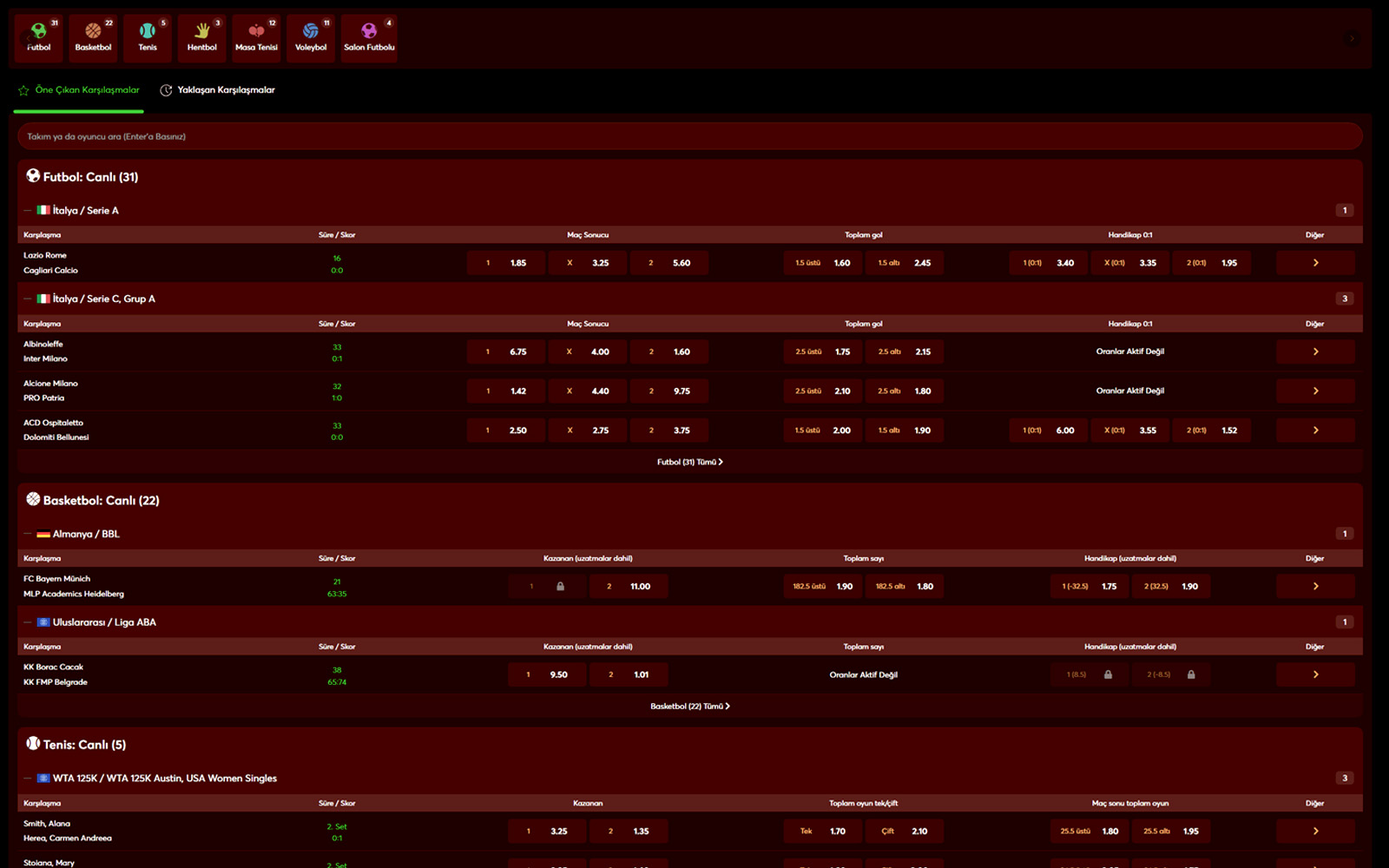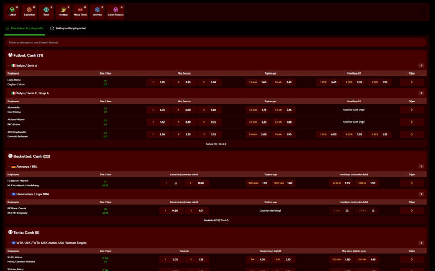 - Futbol, basketbol, tenis, voleybol ve espor branşlarında zengin bahis seçenekleri