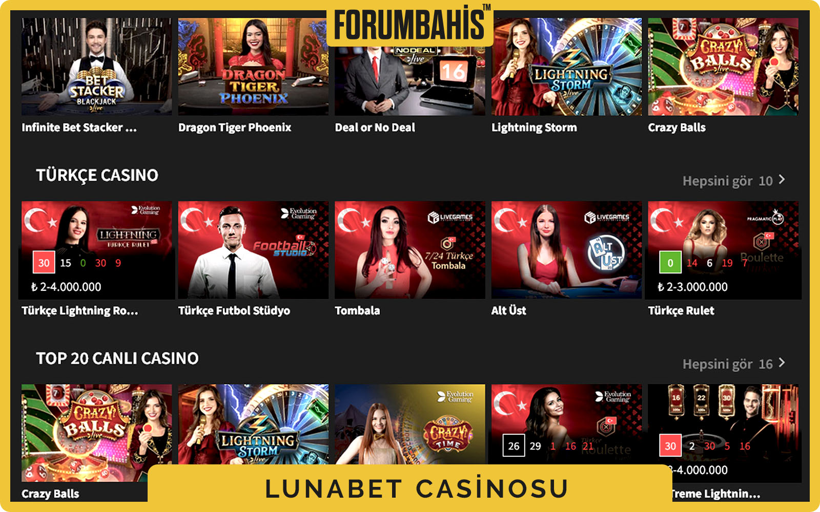 Casino bölümünde NetEnt, Pragmatic Play, Evolution Gaming, Ezugi gibi sektörün dev sağlayıcılarının oyunları bulunuyor. Slot, jackpot, masa oyunları ve canlı casino kategorilerinde yüzlerce seçenek sunuluyor. Lunabet’in canlı casino masaları, farklı bahis limitleri ve gerçek krupiyelerle zenginleştirilmiş. Özellikle yüksek limitli masalar, profesyonel oyuncular için cazip hale geliyor.