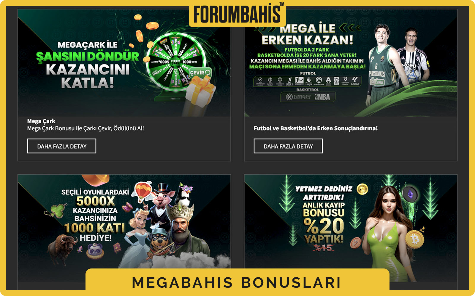 Megabahis, yeni ve mevcut üyelerine çeşitli bonuslar sunarak sektörde fark yaratıyor. Hoş geldin bonusu, kayıp bonusu, yatırım bonusları ve VIP programı en çok tercih edilen promosyonlar arasında. Hoş geldin bonusu genellikle %100 oranında ve 2.000 TL’ye kadar sunuluyor. Kayıp bonusları ise, haftalık kayıplarınızın %15’ine kadar geri ödeme sağlıyor. Bonusların çevrim şartları, bonus türüne göre değişmekle birlikte, genellikle 10x ile 20x arasında değişiyor. Slot ve casino bonuslarında ise, bazı oyunlar çevrime dahil edilmiyor.