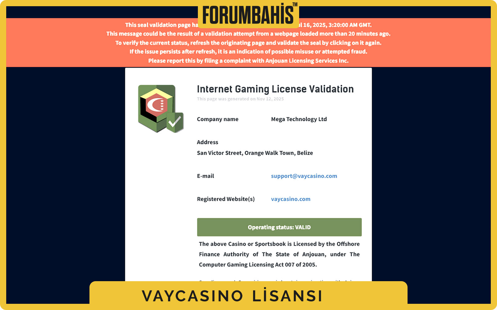 Bir bahis sitesinin en kritik noktalarından biri, sahip olduğu lisans ve altyapıdır. Vaycasino, maalesef lisanssız olarak faaliyet gösteriyor. Bu, kullanıcıların yasal bir hak talep etmesini zorlaştırıyor ve siteye olan güveni azaltıyor. Altyapı anlamında ise BetConstruct gibi köklü bir sağlayıcıdan hizmet alıyor olması, teknik açıdan bir artı. Ancak lisanssızlık, kullanıcıların karşılaşabileceği olası sorunlarda başvuracak bir merci olmamasına neden oluyor.